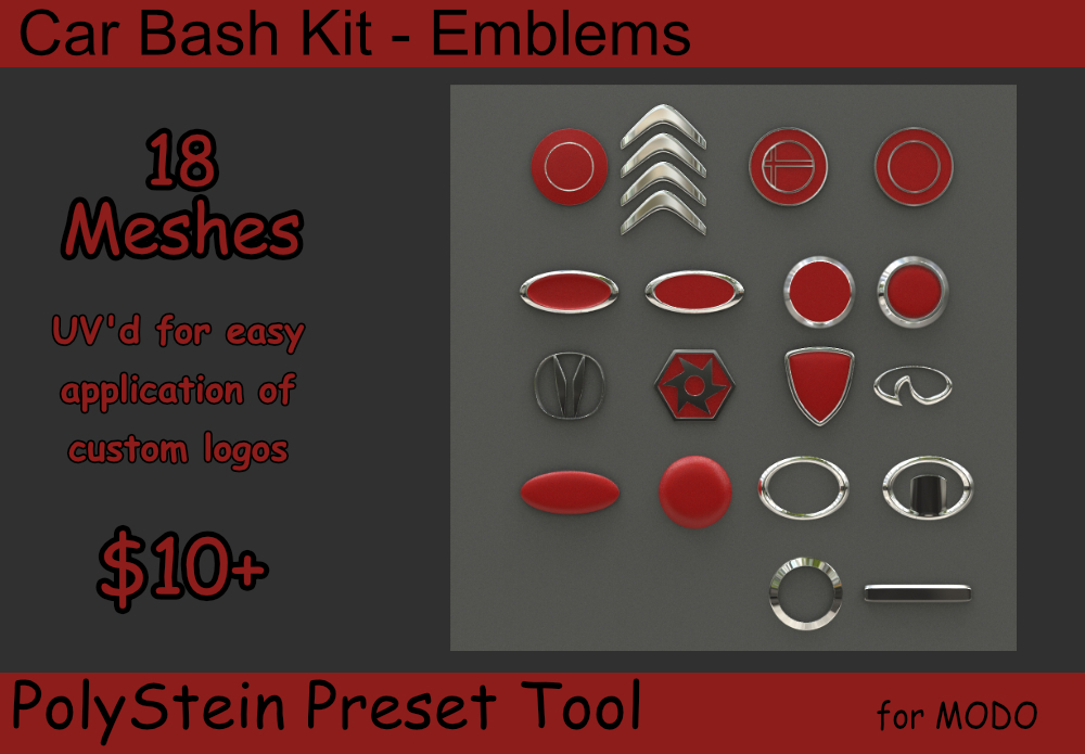 This collection includes 18 presets of brand emblem shape concepts. Each mesh is scaled to 4 inches on the x-axis for managing expectations when "dropping" and are designed to be forgiving when dropping on curved surfaces. In addition to the scale and design, the meshes are UV'd for easy application of your own customer LOGO or even for direct import into your favorite game engine. The meshes are preconfigured with a chrome base and some of them have predefined materials for custom texture maps/logos. This collection provides a variety of shapes that stand alone or can even be used together to create more complex branding emblems. All presets are watertight and quad-only.